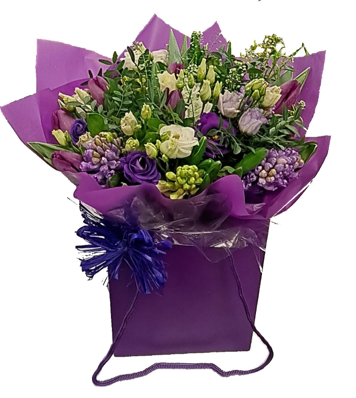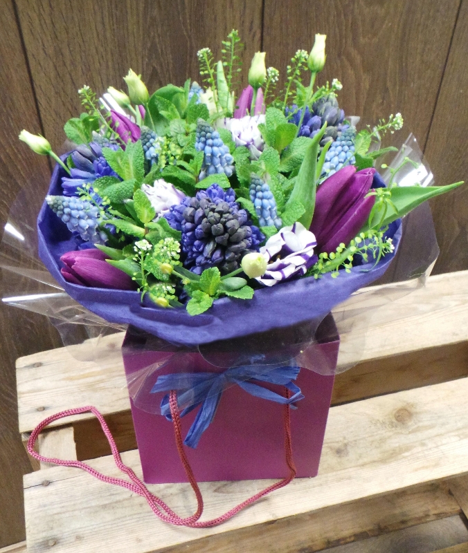 Aqua packed bouquet in a gift bag in shades of blues,deep pink, purples, & a hint of white, mixed with a variety of foliage consisting if perfumed hyacinths, tulips and lissianthus.A great choice .Gift bag colour may vary.