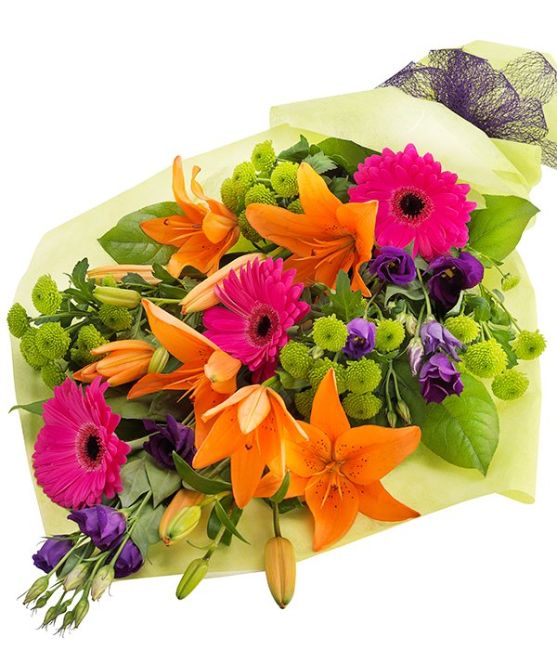 Bright and Vibrant bouquet created using a seasonal selection of flowers in shades of orange, purple, cerise, & green.
