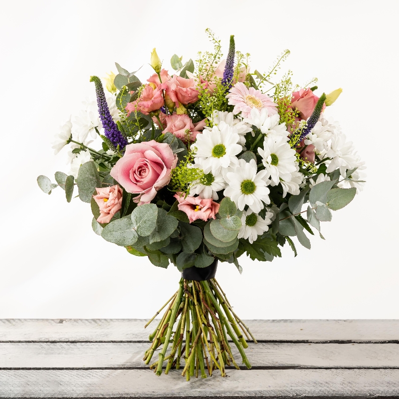 The Blickling Bouquet is a pretty hand-tied using seasonal flowers. Our florists use a gorgeous mix of blooms such as pink roses, purple veronica, pink lisianthus, and white chrysanthemum , with added green foliage for a soft texture.