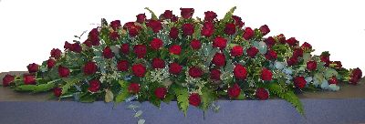 Coffin Spray of beautiful Deep Red Roses,arranged with a variety of foliage.Also available in  Light Red,White, Yellow & Pink.